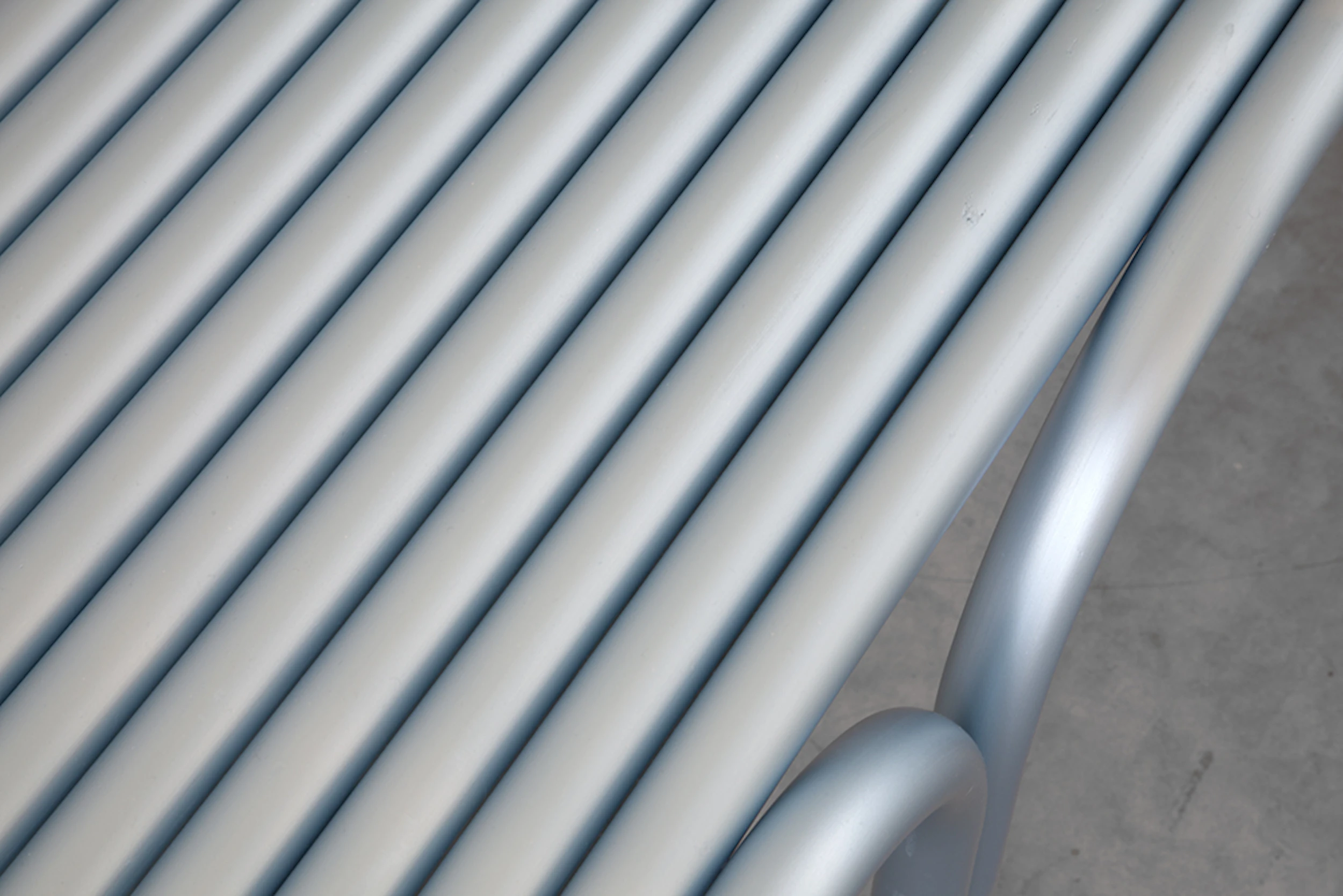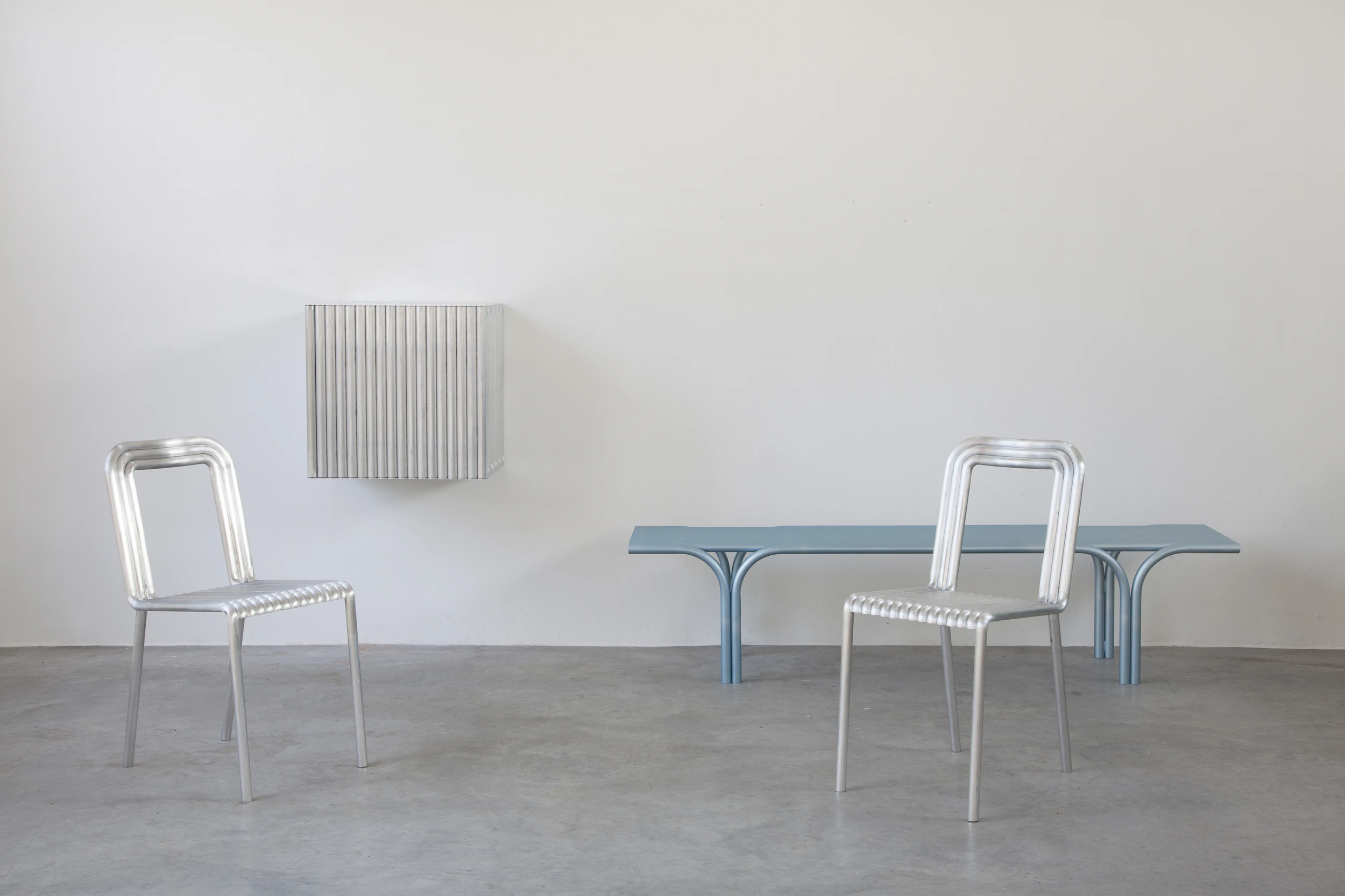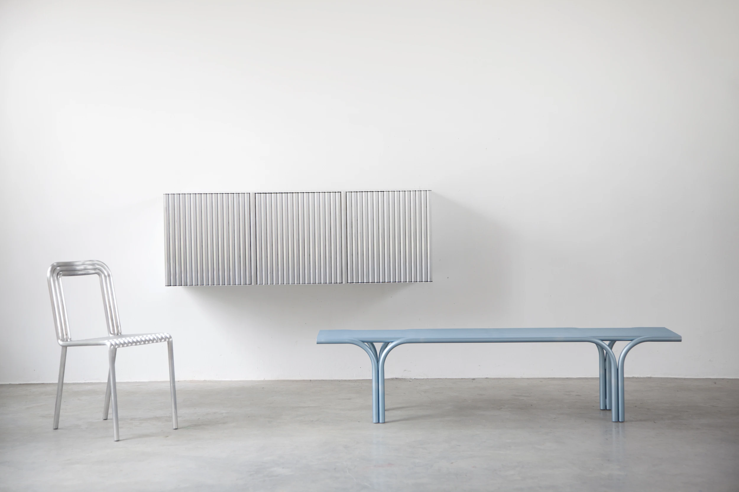 In the cabinets, tubes are placed in close rhythmic repetition to form cabinet faces, their density creating a soft undulation across the surface. For the bench and chair, the approach shifts: the tubes are bent rather than arrayed, and the bending introduces a quality that straight aluminum resists. The material, which can feel cold and rigid in its flat-sheet or extruded forms, becomes tactile and approachable through the curve. The bend is doing structural and perceptual work at the same time.
