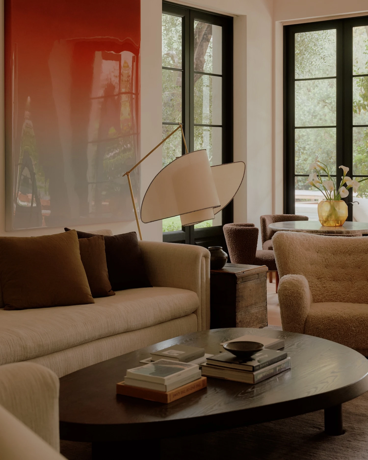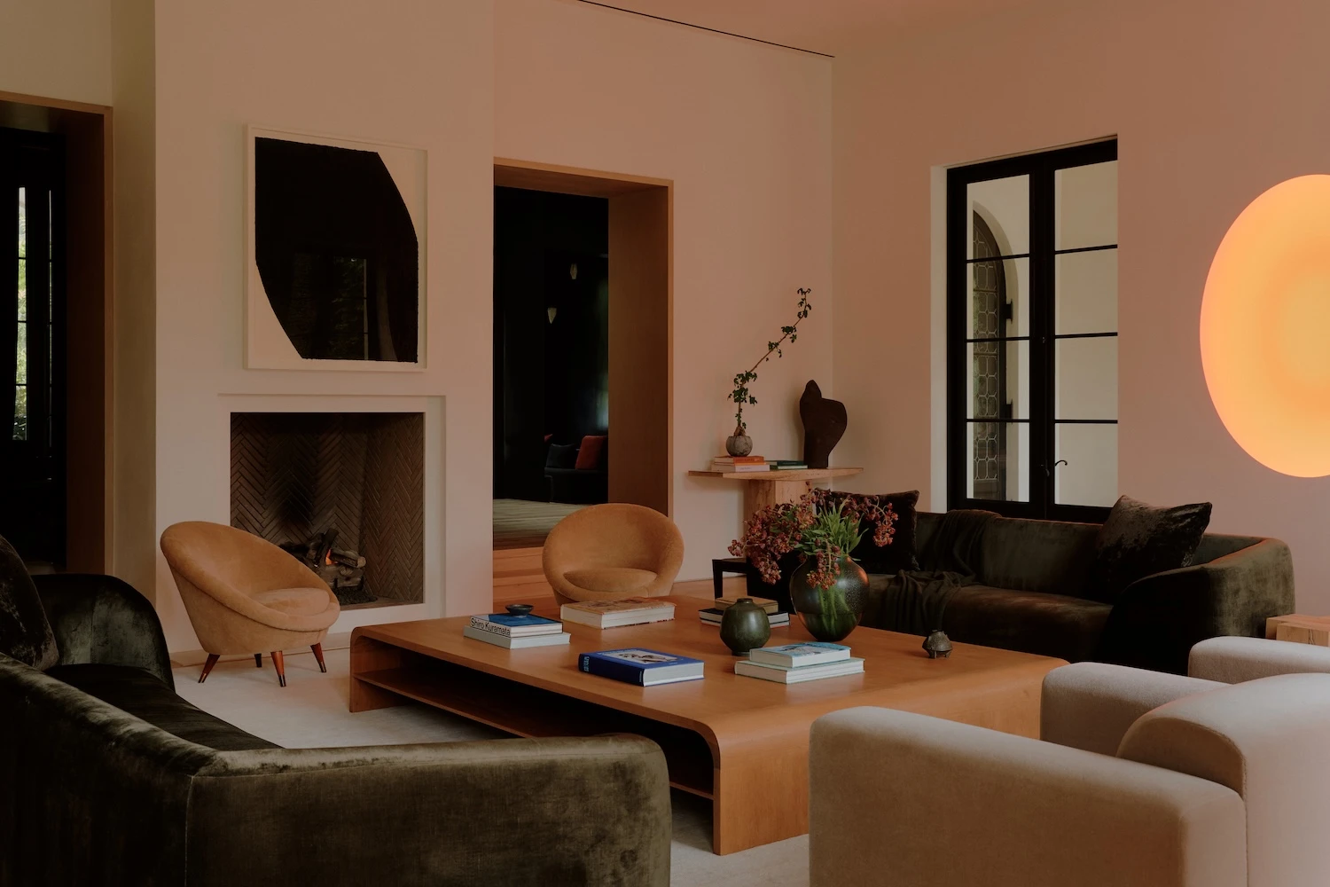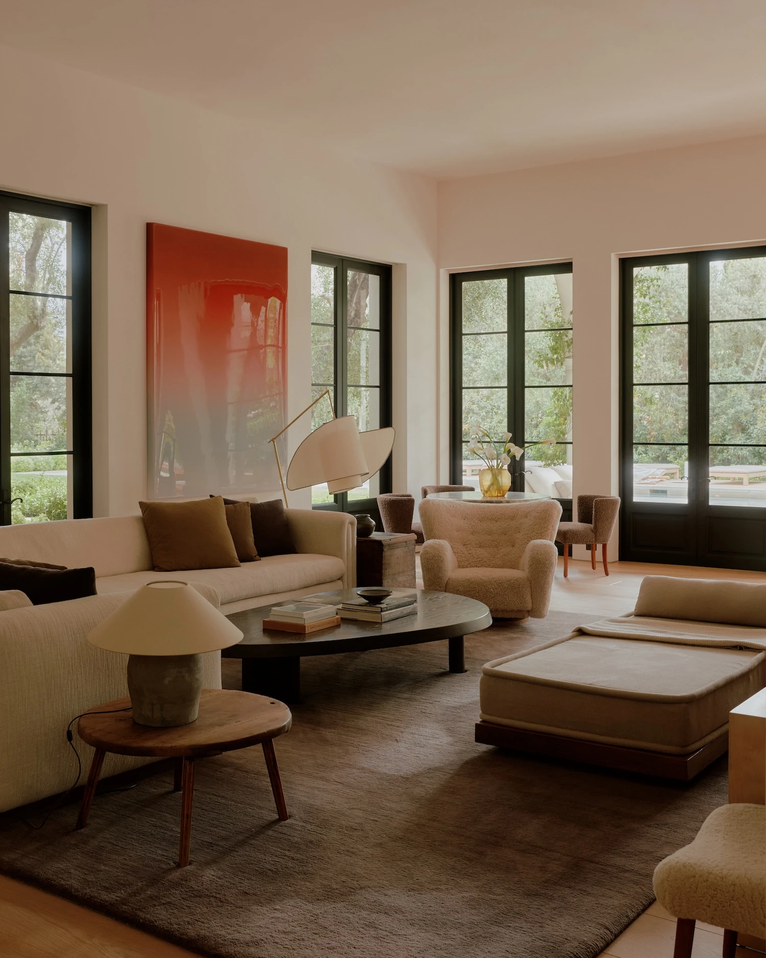The palette begins with creamy walls and pale oak floors that push light into every room, working against the heaviness the Tuscan idiom can produce. Ebonized window and door frames run throughout, providing graphic definition that keeps the scheme from reading as soft or undifferentiated. Ceiling heights were harmonized across the house, a structural decision with direct perceptual consequences: the rooms resolve into more cohesive proportions than the original typology permitted, and the sense of air and volume shifts accordingly.
