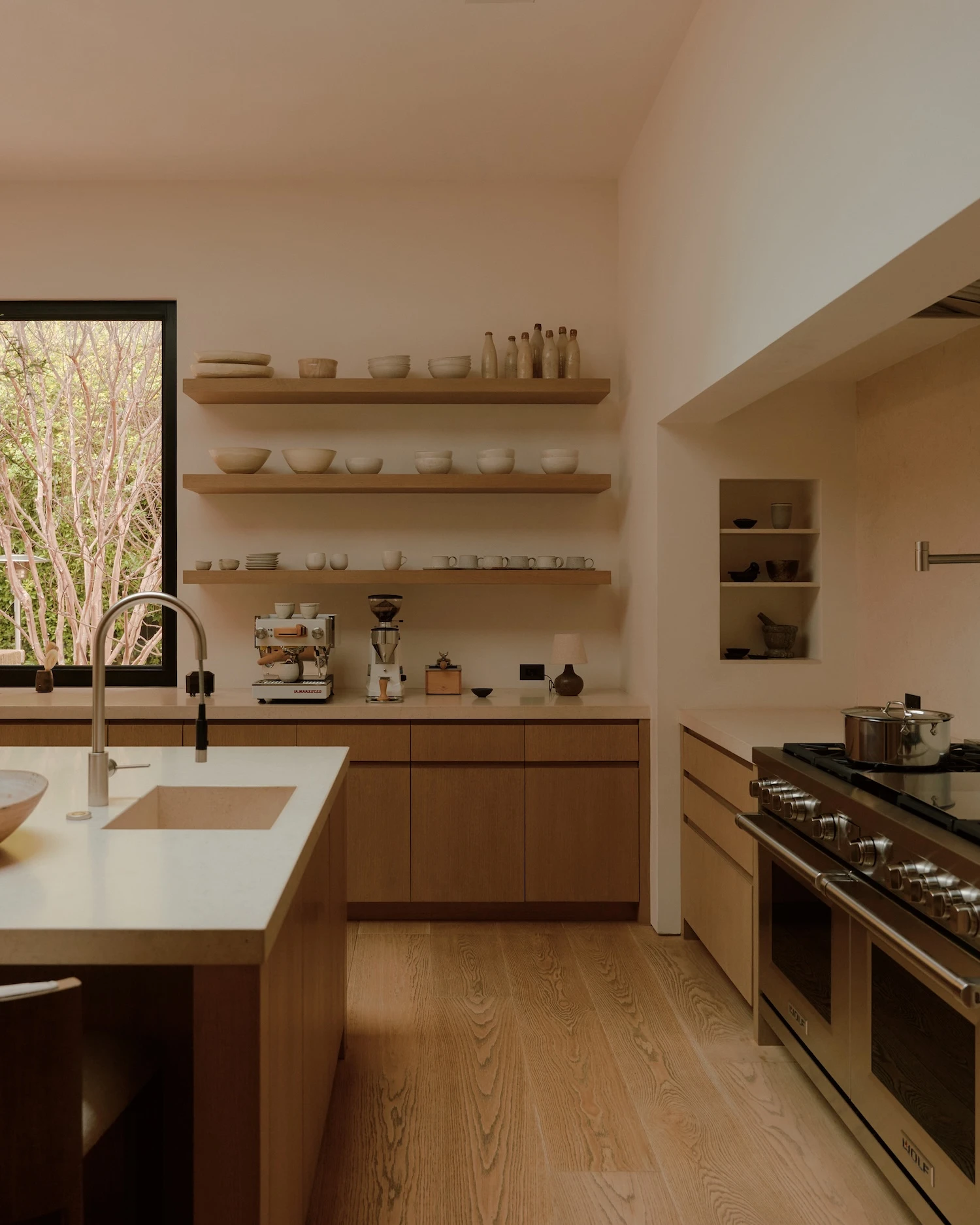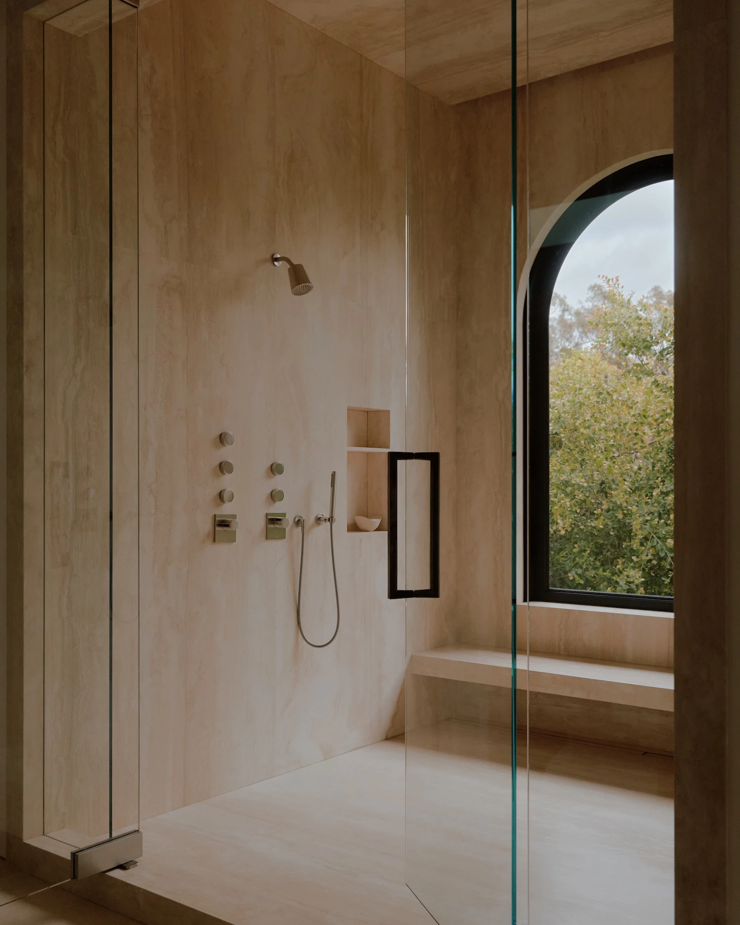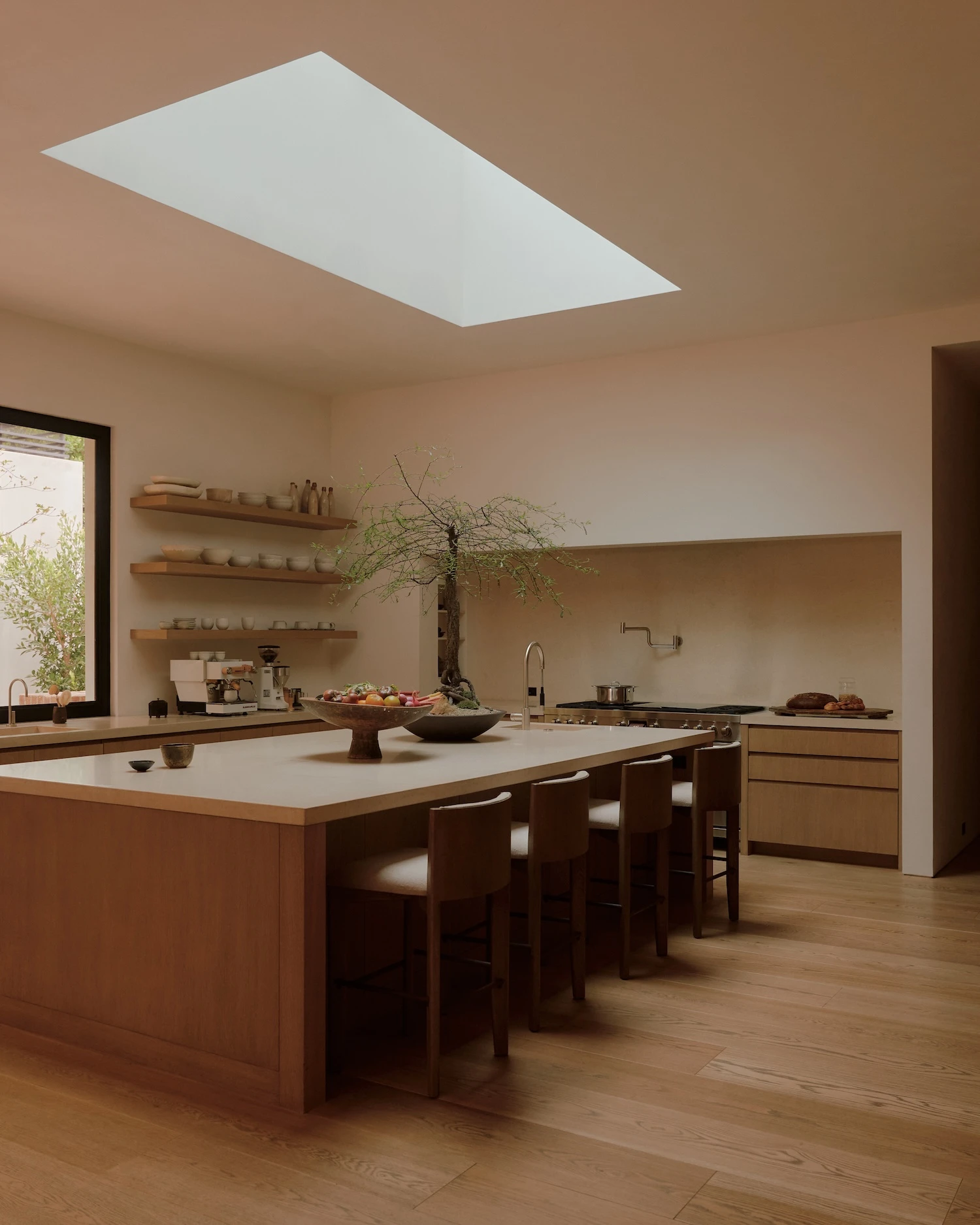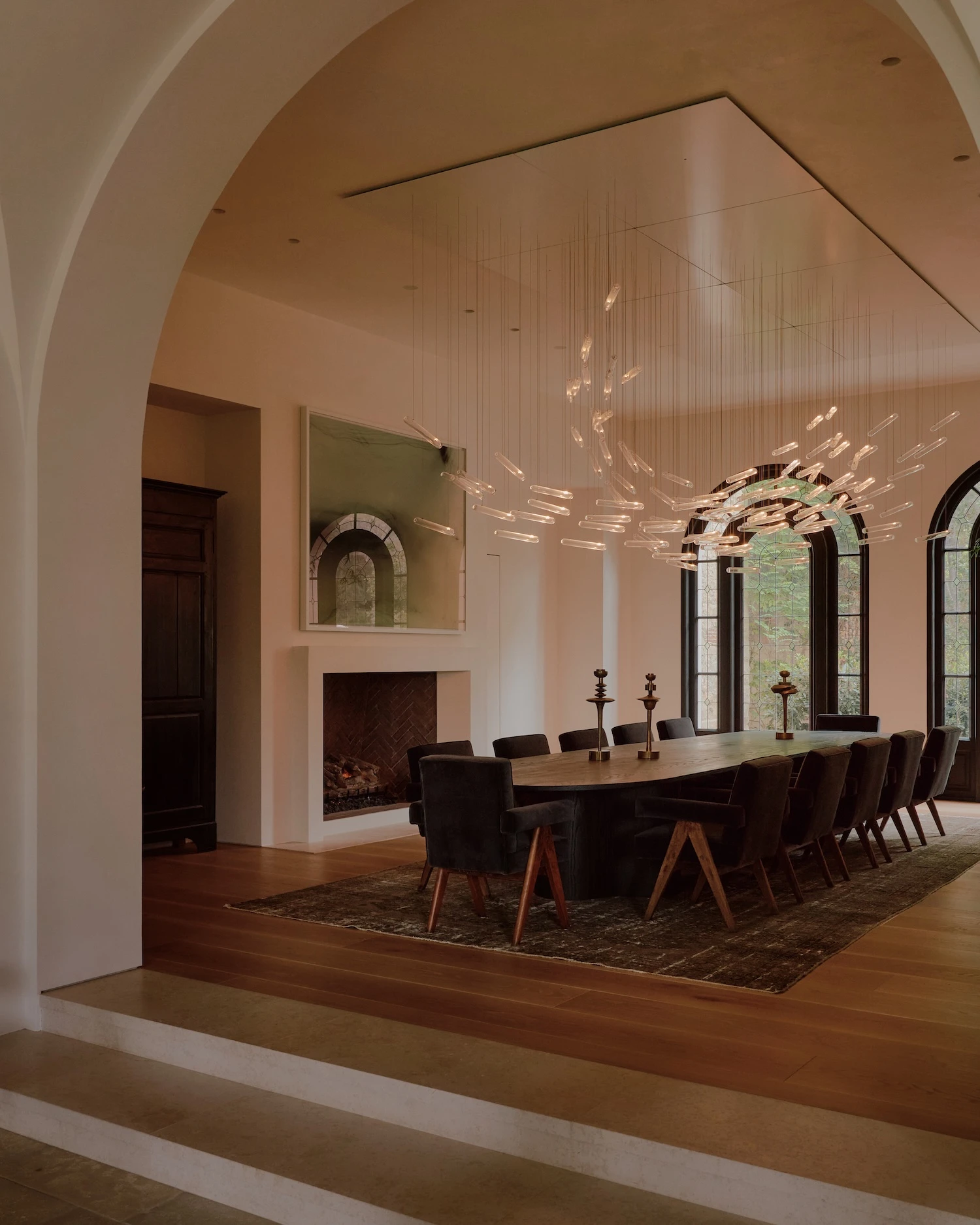 The palette begins with creamy walls and pale oak floors that push light into every room, working against the heaviness the Tuscan idiom can produce. Ebonized window and door frames run throughout, providing graphic definition that keeps the scheme from reading as soft or undifferentiated. Ceiling heights were harmonized across the house, a structural decision with direct perceptual consequences: the rooms resolve into more cohesive proportions than the original typology permitted, and the sense of air and volume shifts accordingly.