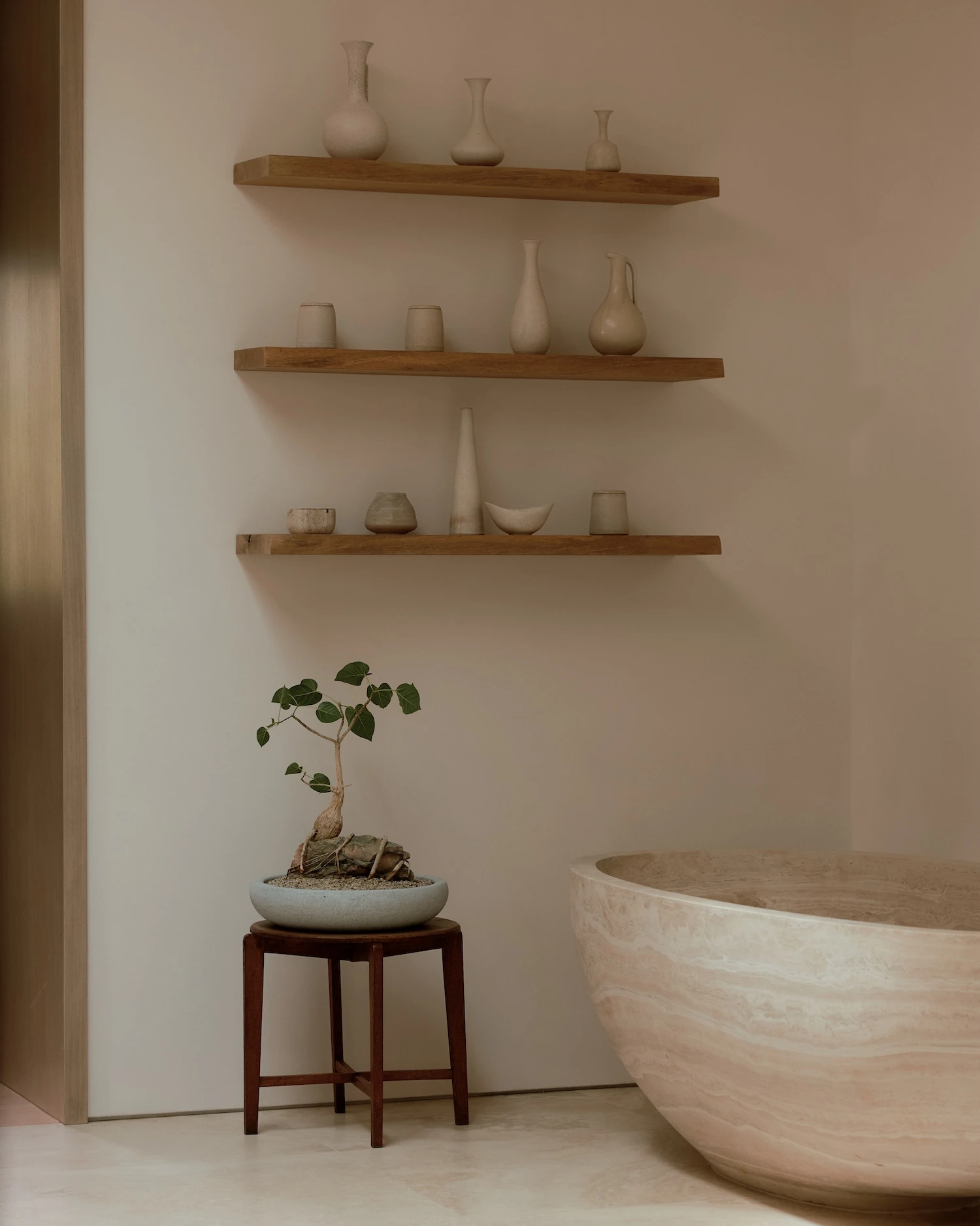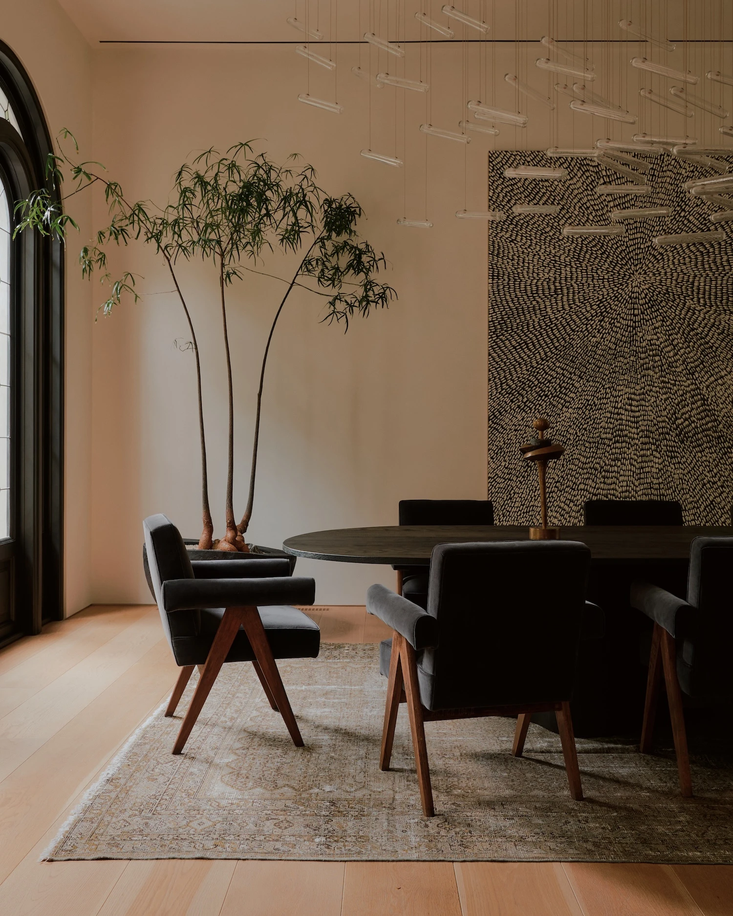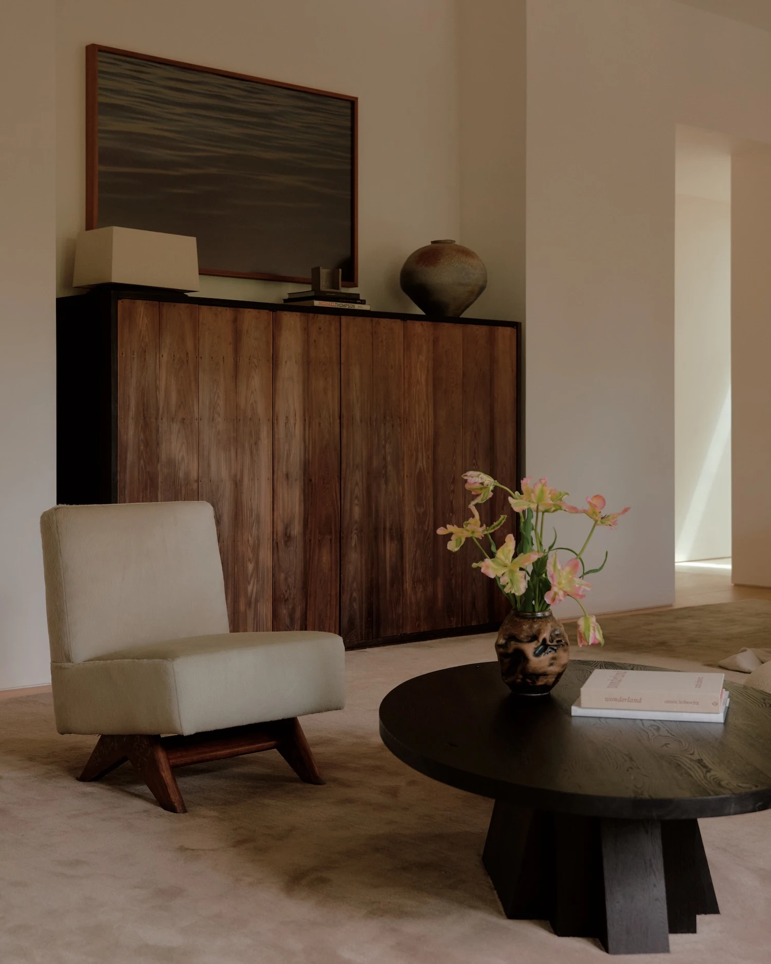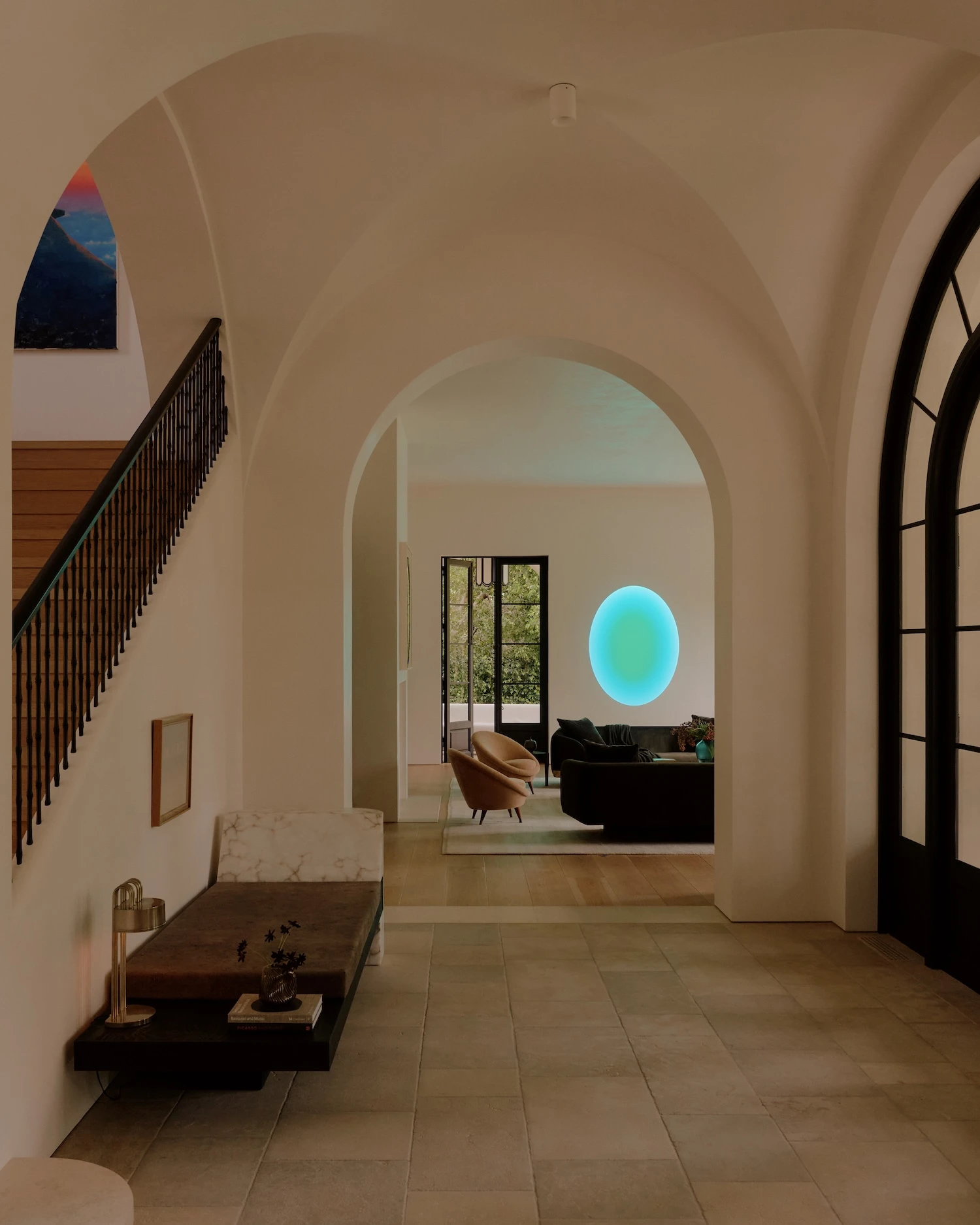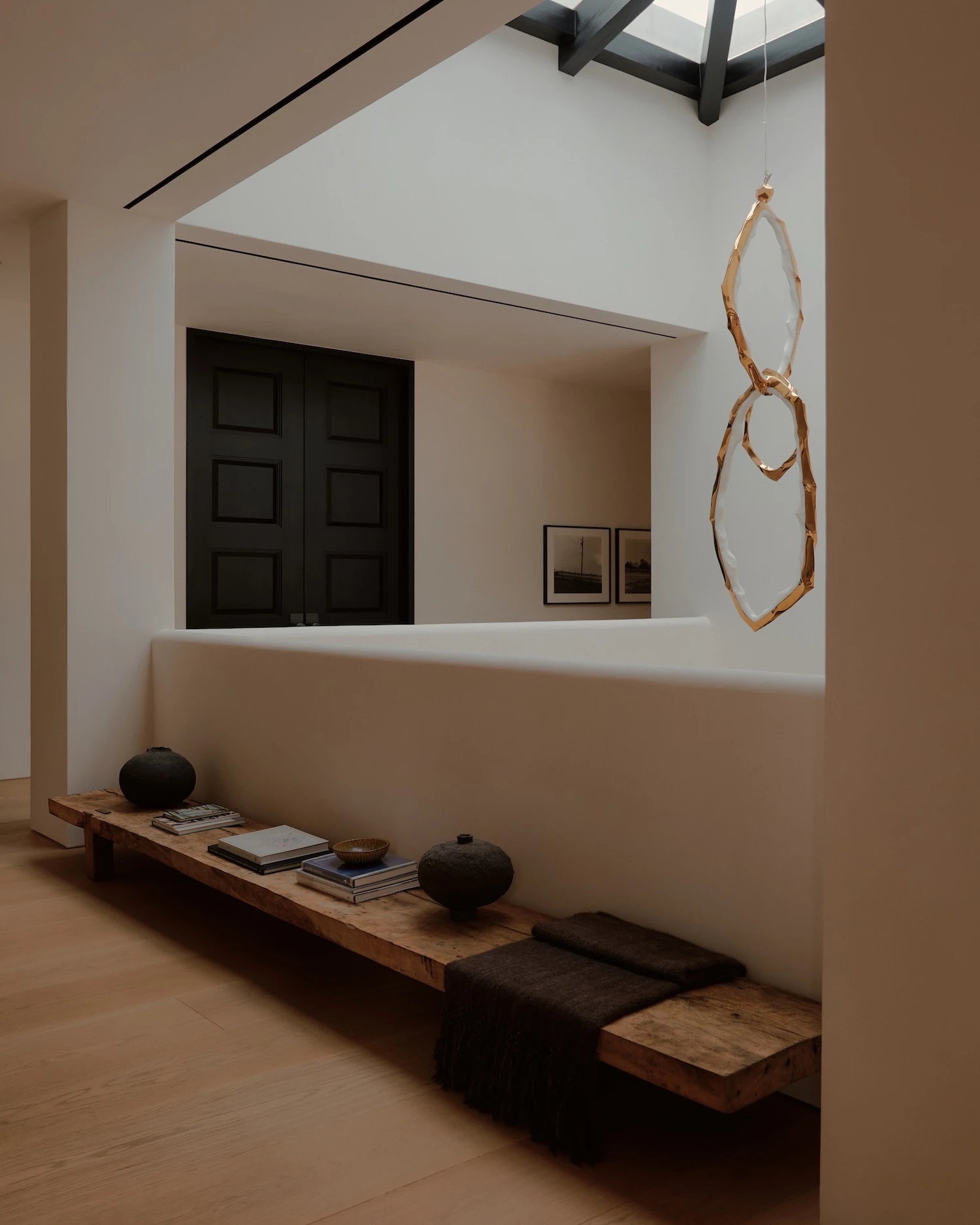 2 standout pieces define the interior's character. A newly commissioned light work by James Turrell operates as an architectural element, its perceptual effects extending the depth and atmosphere of the room beyond what conventional lighting can achieve. A Rick Owens Alabaster and Black Plywood daybed from Carpenters Workshop Gallery anchors the space in a different register entirely, its characteristic combination of material weight and draped softness sitting in precise tension with the lightness of the surrounding palette.