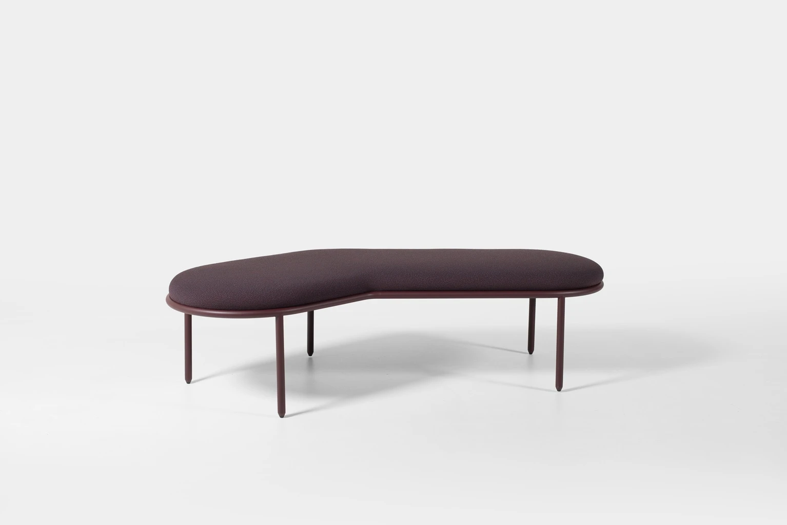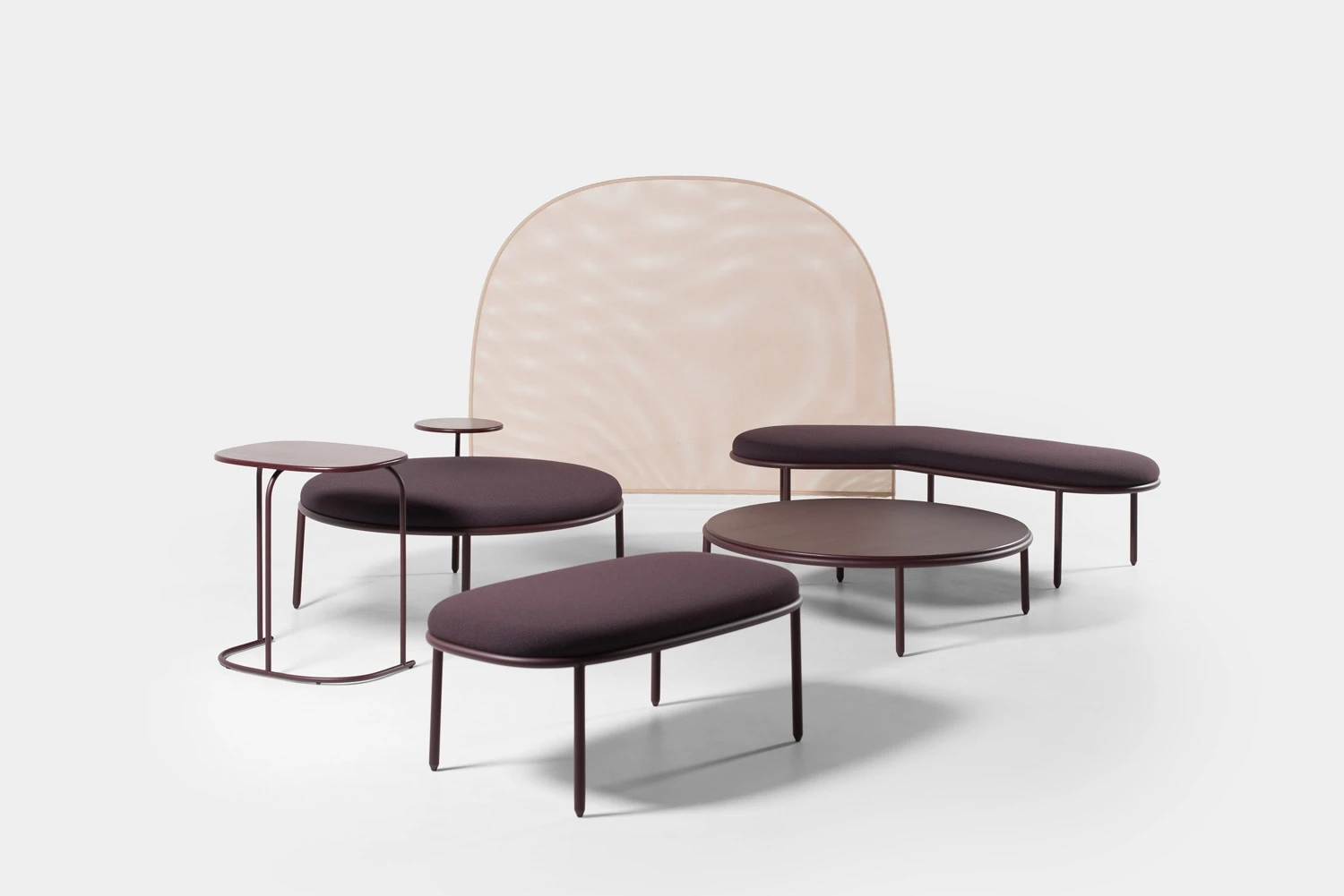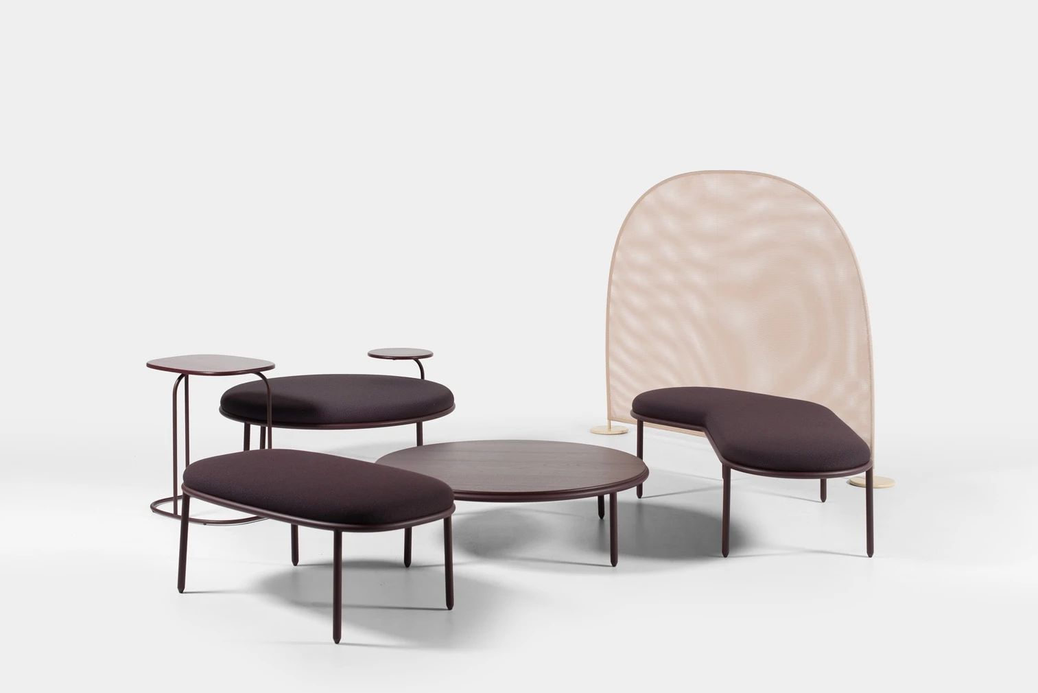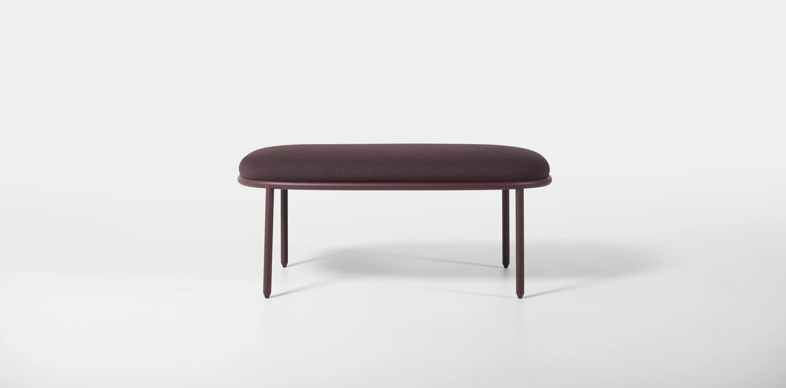 The range spans 6 pieces: 2 benches, a large circular bench, a low table, a screen, and an occasional table. The circular bench is the formal anchor of the collection, its shape making the campfire analogy most explicit by creating a defined gathering zone without enclosing it. The screen introduces a degree of acoustic and visual separation without closing off the space, allowing the collection to define territories within open-plan settings while keeping them permeable.