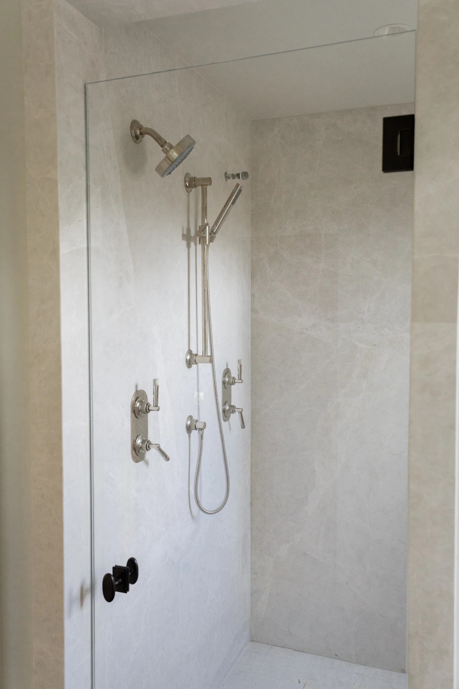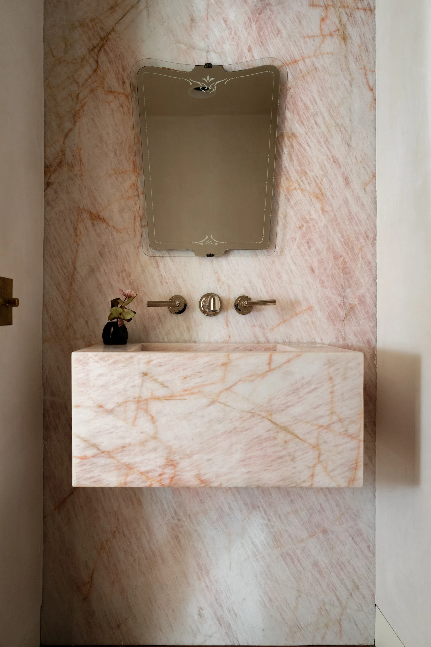 Stone does the heaviest work throughout. Fior di Pesco Italian marble covers the kitchen countertops. Mexican tumbled limestone runs through key living areas, and a chocolate travertine fireplace anchors the main room. Pink lady quartzite lines the powder room. Aged limestone covers the floors. Cedar wraps the elevated ceilings, and abundant skylights and windows pull daylight deep into the plan. Custom Venetian plaster and walnut wood paneling appear in the communal zones, adding surface variation without introducing visual noise. The materials are chosen to age well and to carry a sense of weight that newer finishes resist.