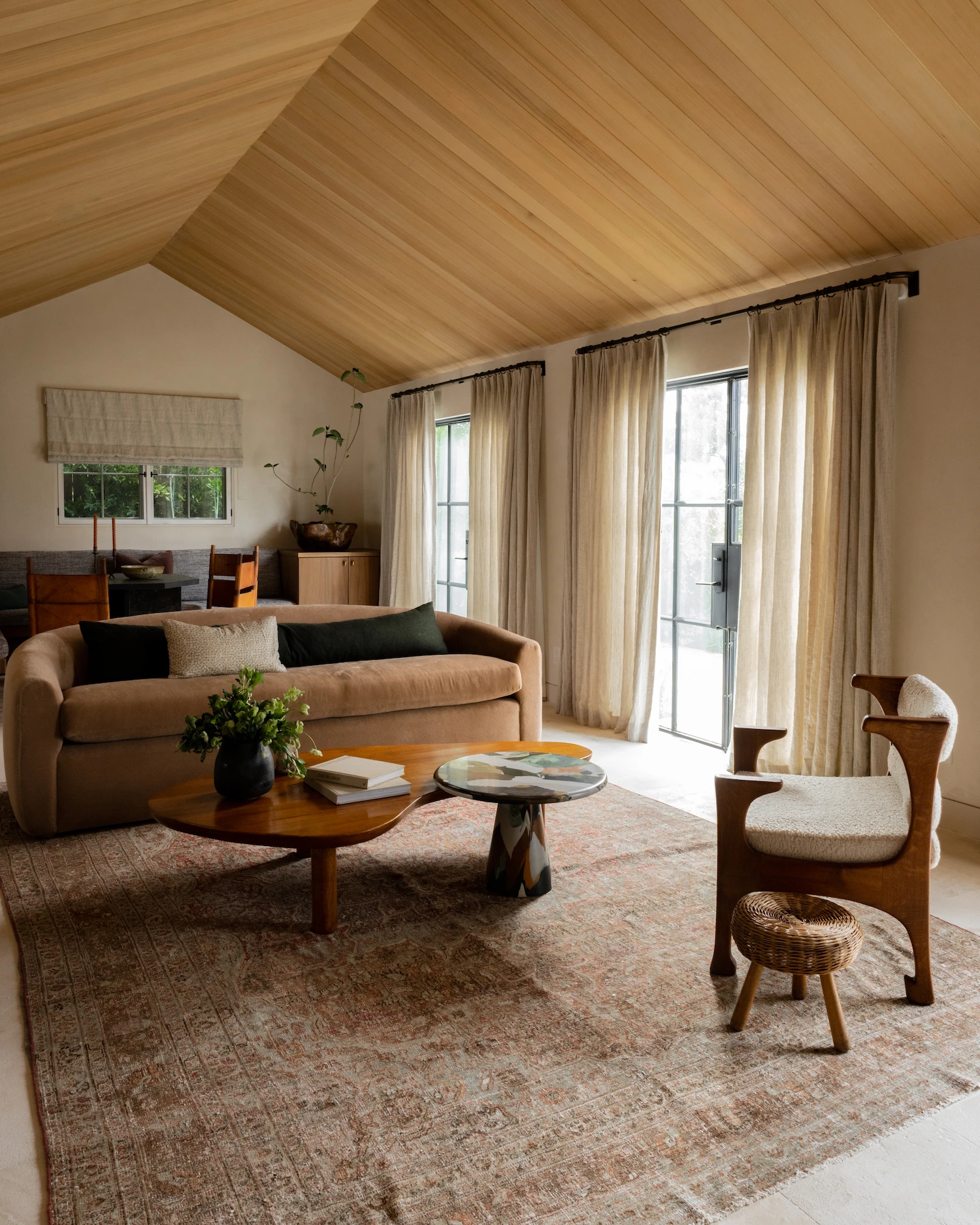 The furniture selection draws heavily on vintage and antique sourcing, which is a consistent thread in Studio Gutow's practice. Arthur Umanoff bar stools, a Carlo Scarpa for Bernini dining set, a marble table from Obsolete, and a Lawson Fenning boucle chair provide the primary layer. A Willy Guhl planter and a Piet Kramer Art Deco cabinet appear in the living area. French mirrors and a repurposed church desk feature in the primary spaces. Persian wool rugs carry a consistent color palette across rooms, supplemented by Fortuny and alpaca pillows, mohair sofas, and headboards in cotton velvet and linen.
