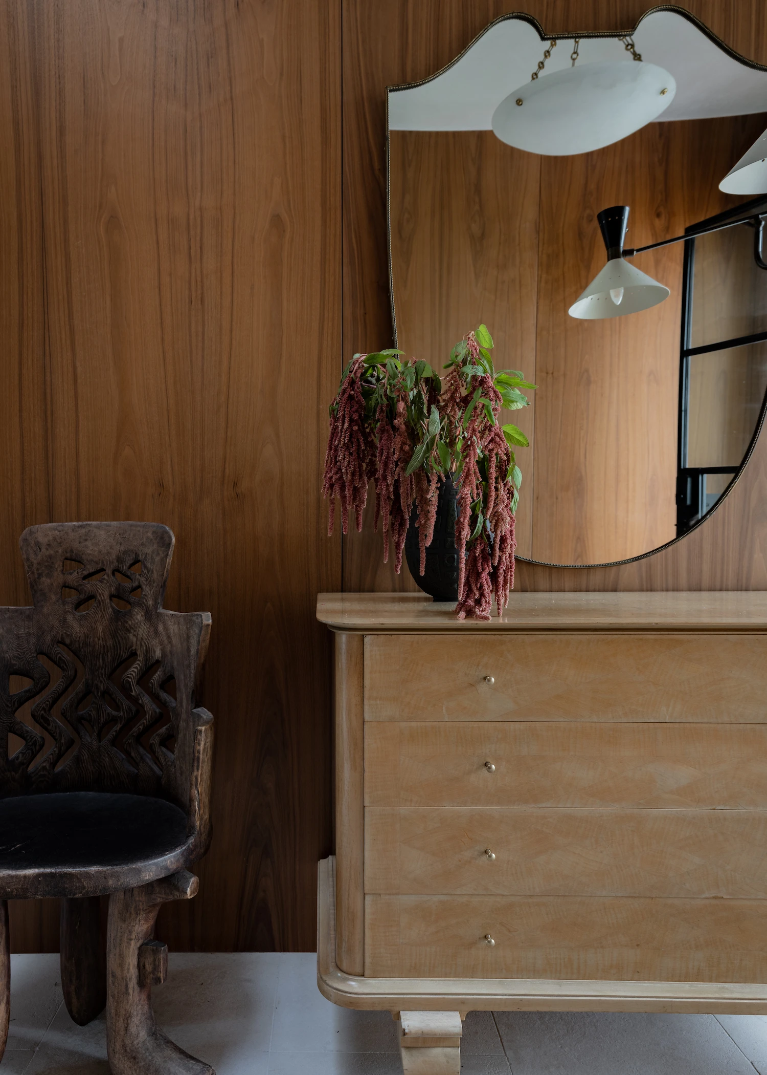 The sourcing strategy here is also practical. Vintage and antique pieces sidestep the extended lead times that have made specifying new furniture increasingly difficult. The result is a home that reads as assembled over time rather than installed at once, which is precisely what the brief required.