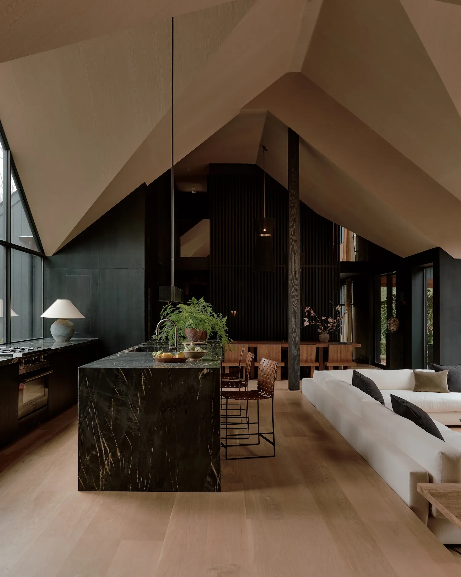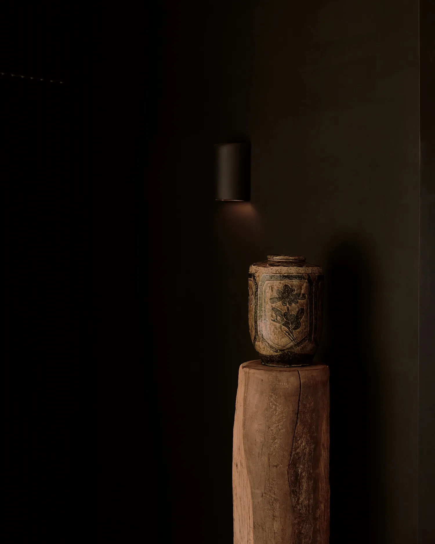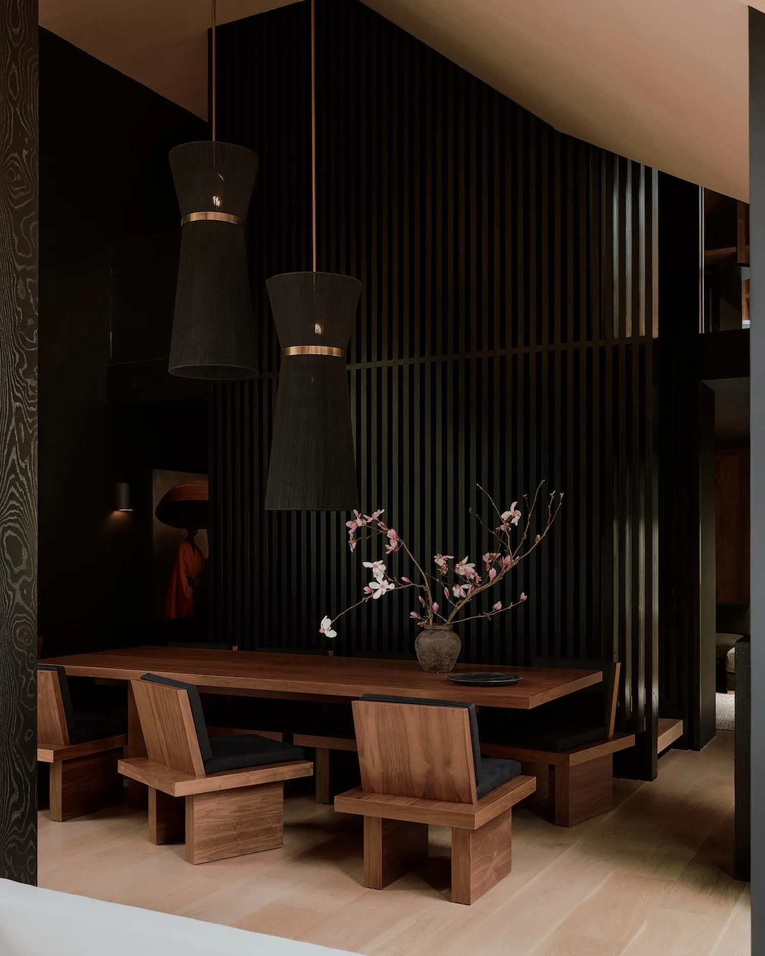 Bespoke craft runs throughout. A kitchen pendant designed by Clunies-Ross functions as a focal sculpture. Reclaimed timber in the wellness areas carries visible grain and weathering, material history made legible rather than smoothed away. The basement introduces a controlled shift in register: darker, more enclosed, offering psychological contrast to the light-filled levels above. The move acknowledges that genuine restoration requires both openness and enclosure, and that stillness is not one mood but several.