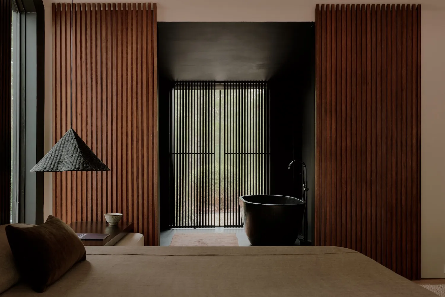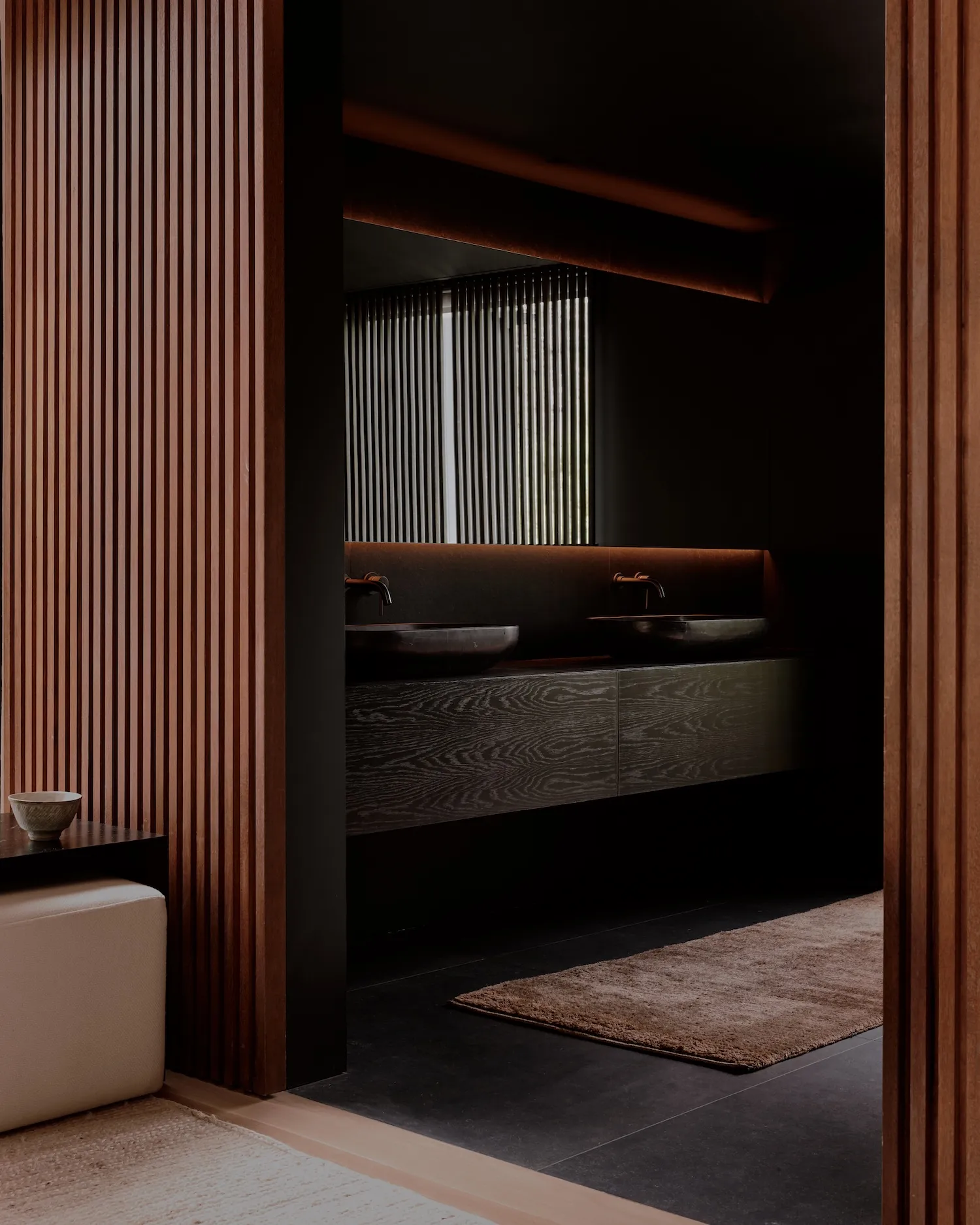 The material palette reads as a direct counterpoint to the high-gloss surfaces of luxury retail. Stone, timber, and linen create an environment that invites touch and registers the passage of time. Custom slatted timber screens modulate daylight throughout the residence, diffusing hard sun into softer, more even light that shifts quality hour by hour. The screens also guide sight lines toward specific moments of focus: a meditation nook, a sculptural bathing area, planted zones that dissolve the threshold between room and garden.