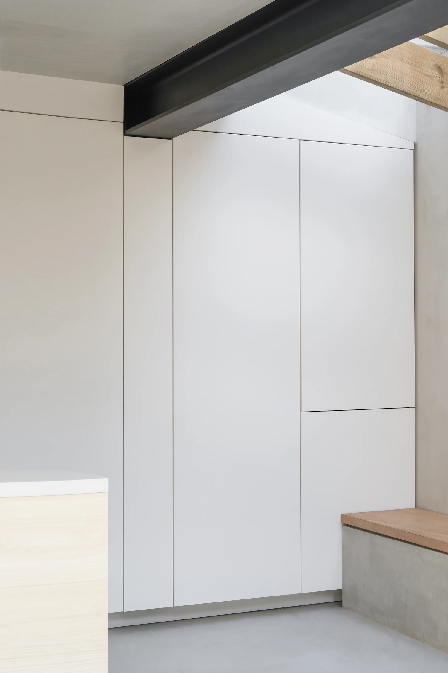 The rear extension is the project's organizing move. A single-storey addition sits at the back of the flat and connects directly to the garden, keeping the boundary between interior and exterior deliberately soft. Walls and ceilings in the extension are finished in washed plaster, and micro-cement lines the shower room, giving the new spaces a consistent, low-contrast surface language that reads as continuous rather than assembled. The extension's pitched roof takes a large skylight, pulling daylight into the core of the plan where north-facing windows cannot reach. Reflective surface treatments on the floors, walls, and ceilings work throughout to distribute that light further.