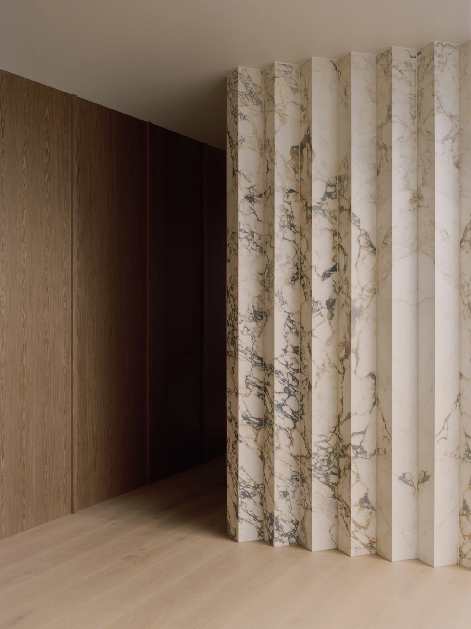 The architecture of the threshold is treated with care throughout. Walls are thickened rather than reduced to planes. Joinery reads as architectural element rather than furniture. Zig-zag screens, blades, and reveals introduce directional shifts that compress and release movement through the home, producing a sequence that resists being understood all at once. The spatial experience accumulates through use rather than revealing itself on first entry.