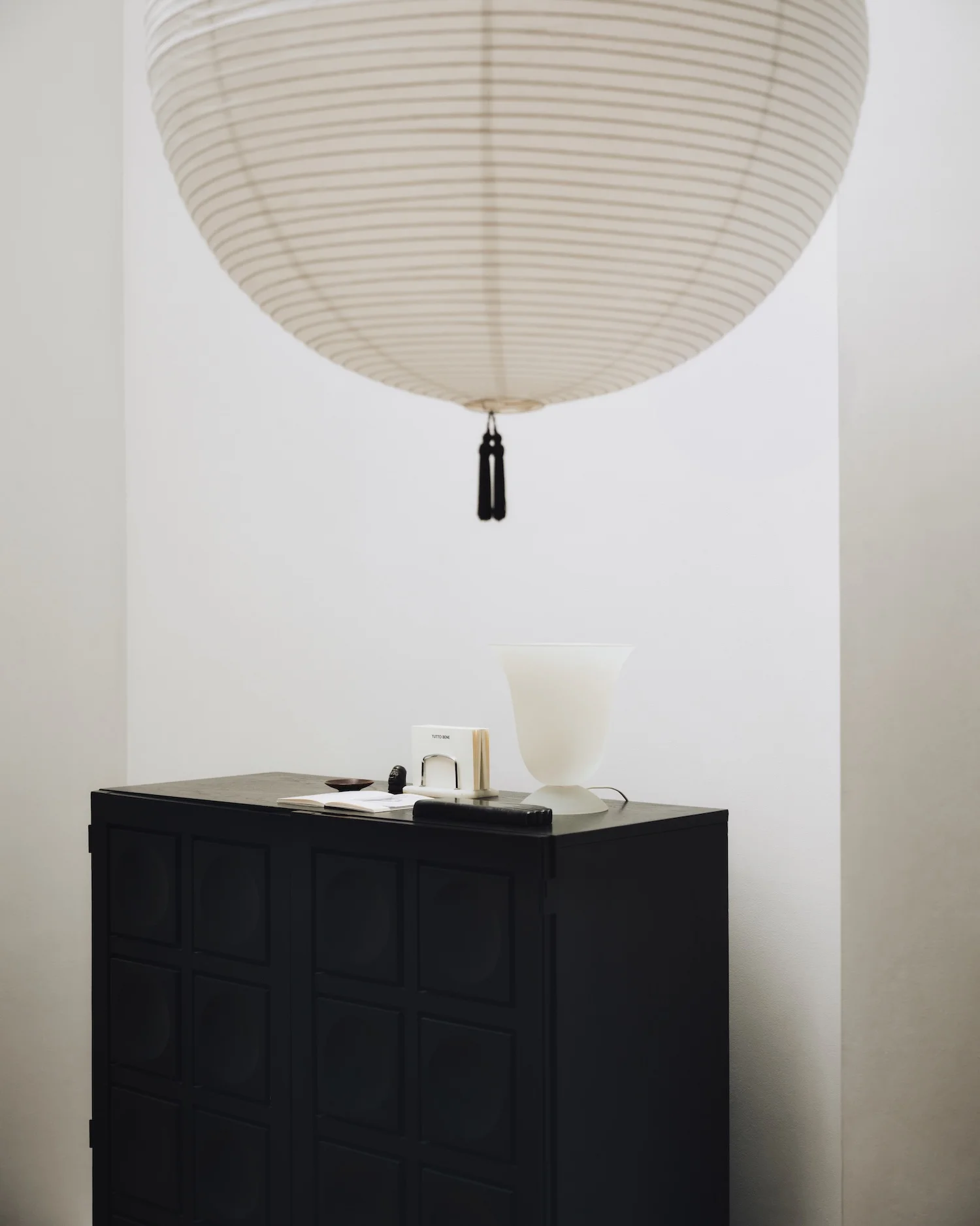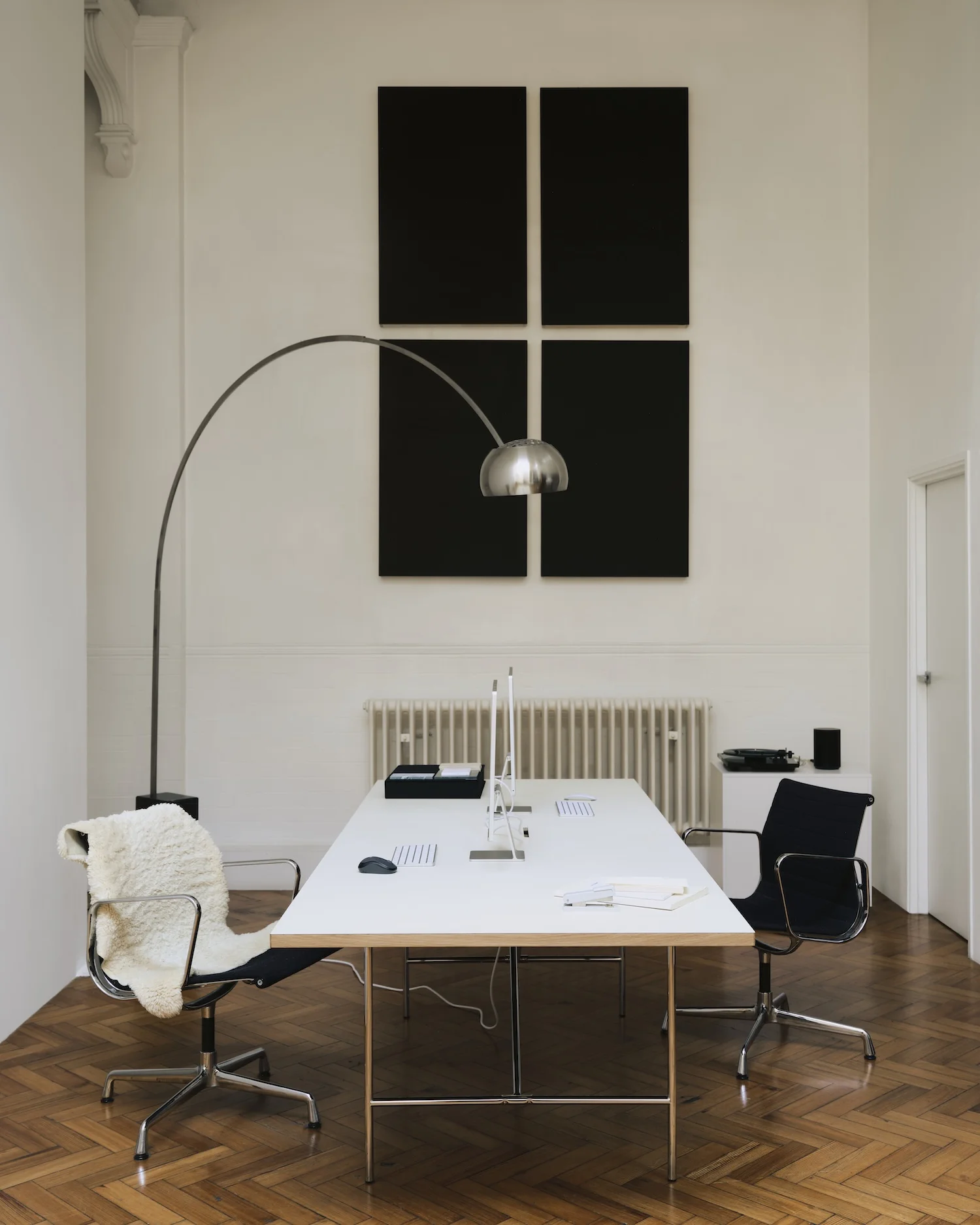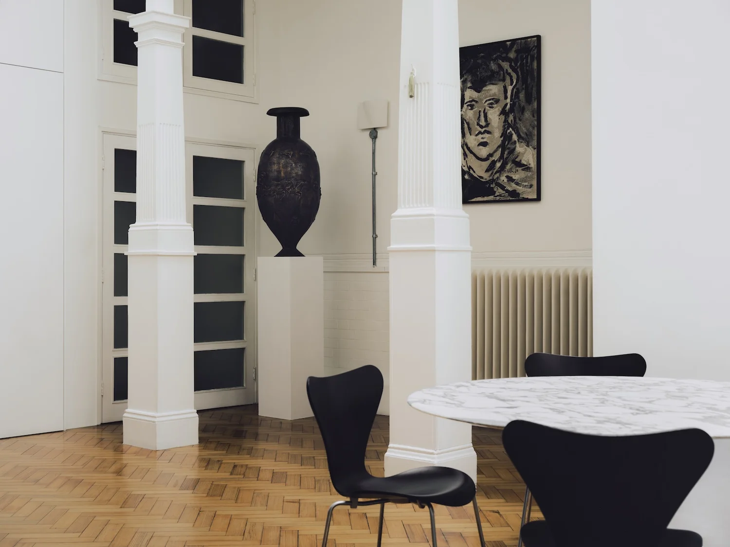 The triple-height ground floor functions as Tutto Bene's studio, lit solely through clerestory windows set high in the gable end. The absence of street-level views creates the kind of focused introversion that workshops and ateliers have historically cultivated. Six-meter white walls rise around the original herringbone floor, where century-old brass hooks once held badminton nets. Victorian columns that formerly defined changing rooms now punctuate the open plan, their fluted profiles providing vertical rhythm without subdividing the volume. Fritz Hansen Ant chairs gather around a vintage Saarinen marble table; a Belgian oak cabinet grounds the space with material heft. 4 black paintings on the wall read alternately as night-sky windows or white crosses, demonstrating how surface treatment can invert spatial perception entirely.