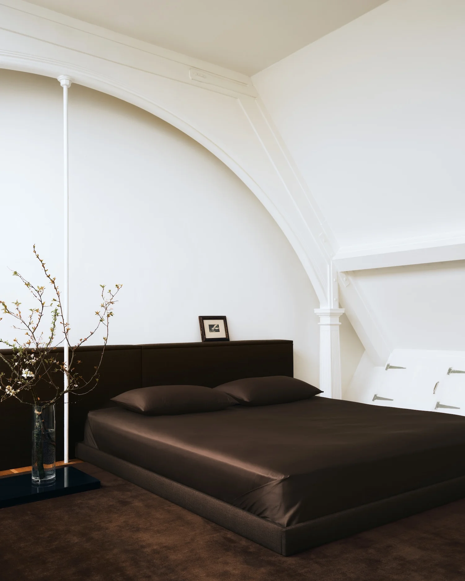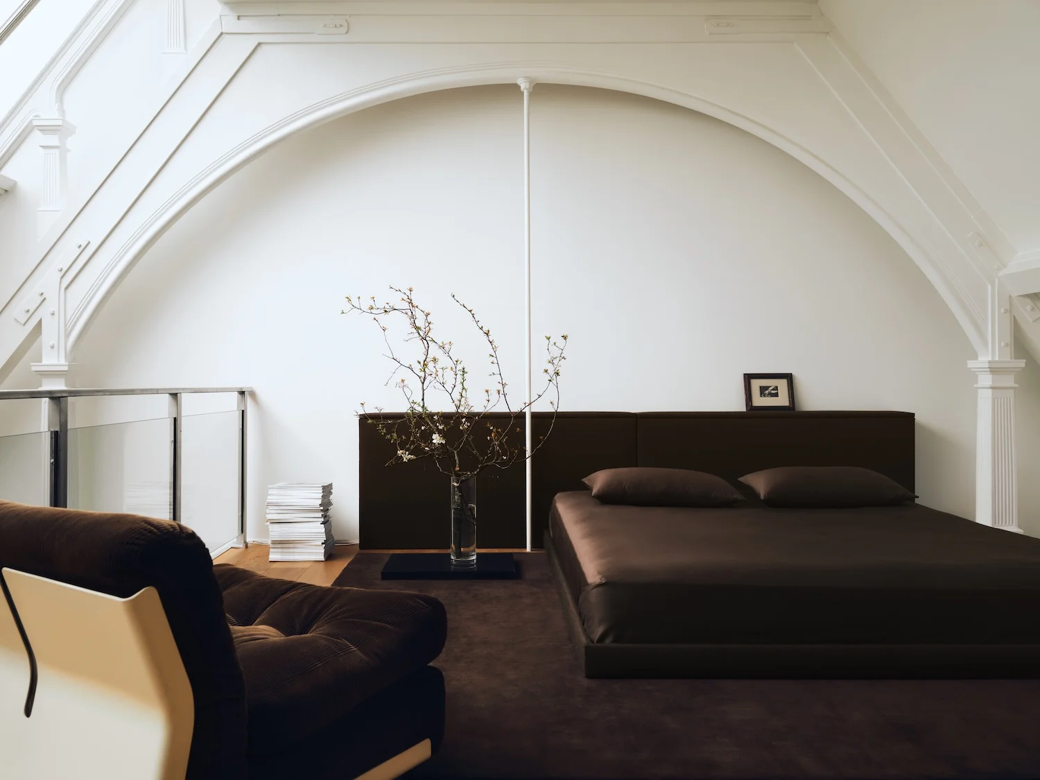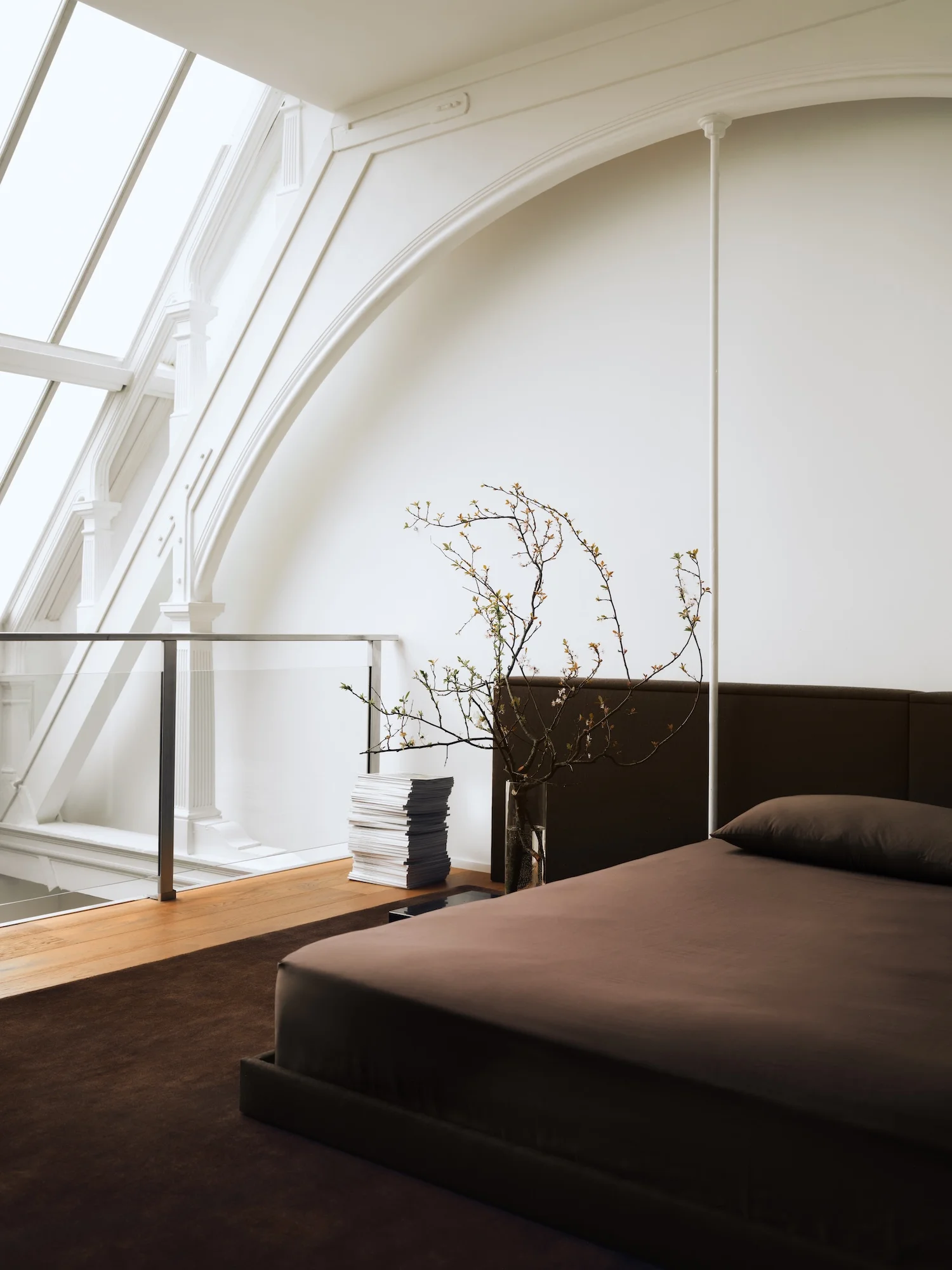 The bedroom sits at the apex beneath a 6-meter atelier window and the full spread of exposed structure. Sleeping under legible architectural logic recalls the spatial discipline of Japanese minka farmhouses or Shaker meetinghouses, where domestic life unfolds within an honestly expressed frame. The bed stays low and monolithic, keeping the body grounded against the vertical reach of the spiral climb below.