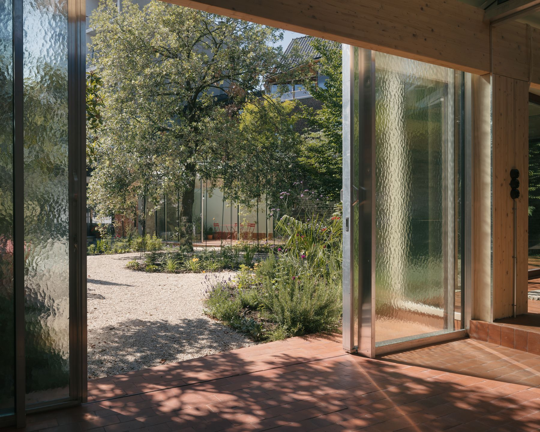 The project adds two light garden pavilions to the site. They’re not heavy structures, more like frames that catch the changing light and open the space to vegetation. Moving through the layout feels less like walking through a house and more like shifting between garden rooms.