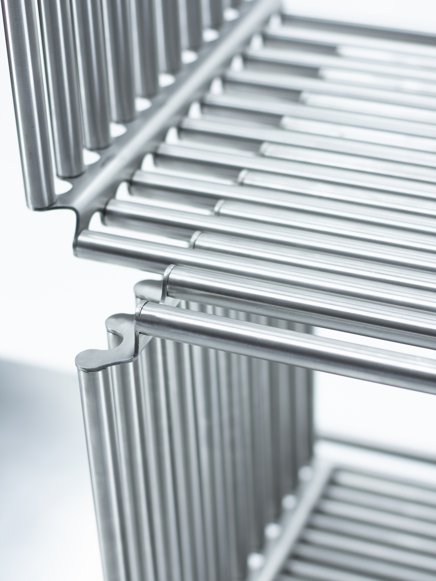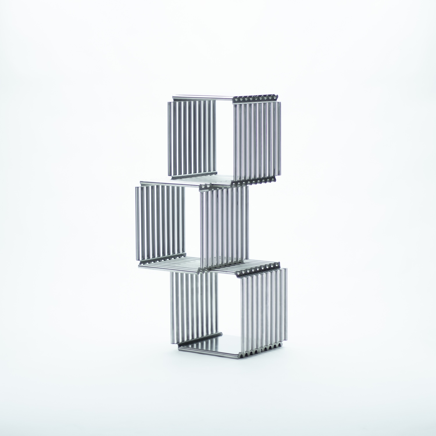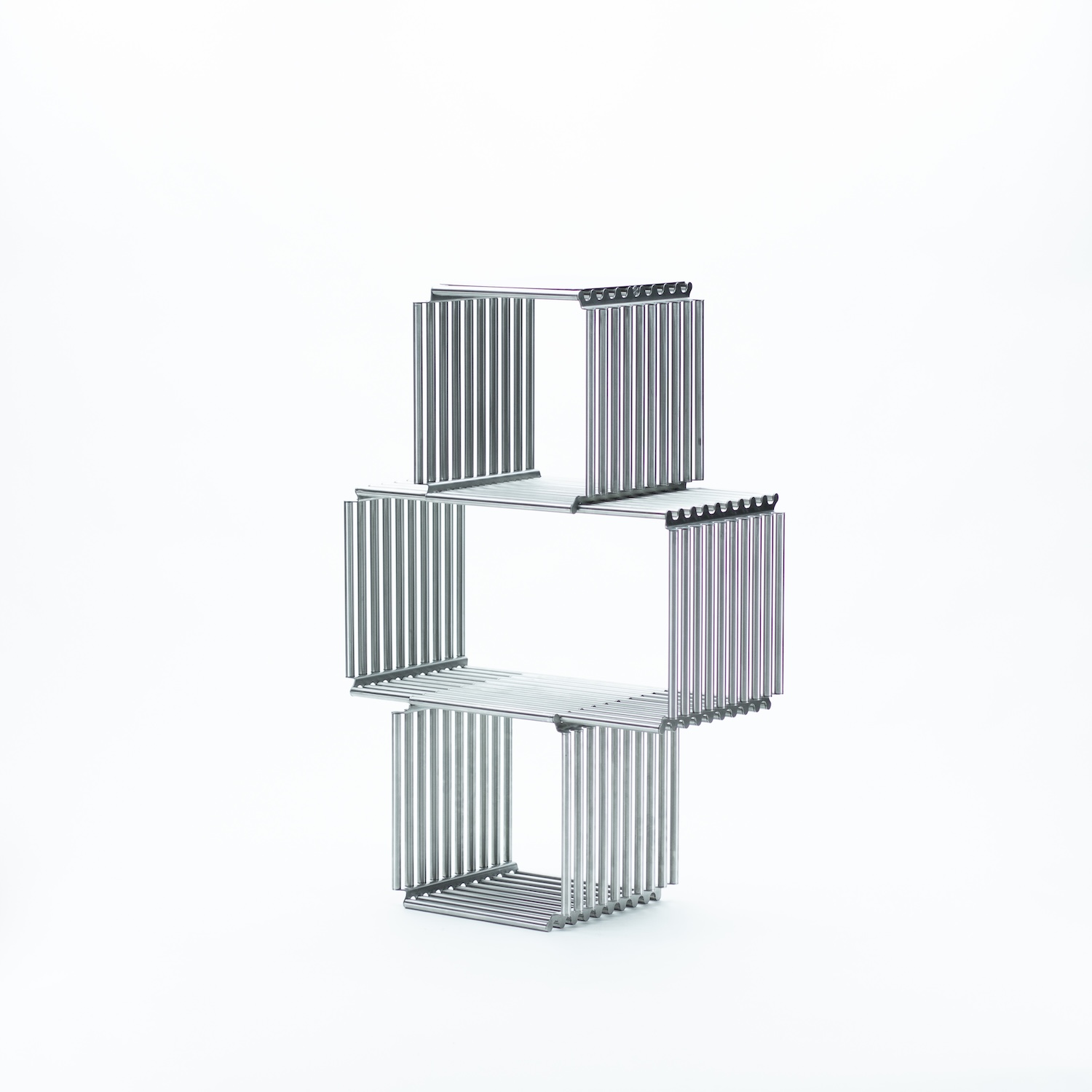 Stainless steel is a demanding material for domestic storage. It resists the warmth of wood and the softness of lacquered metal, demanding that a design earn its place through structural clarity and formal precision. Alarcón works with sheet metal and welded joints rather than cast or extruded profiles, keeping the system visually lean while maintaining the load capacity and vertical stability necessary for a shelf designed to grow in height. The lightness relative to structural performance is not incidental; it is the central engineering problem the design solves.