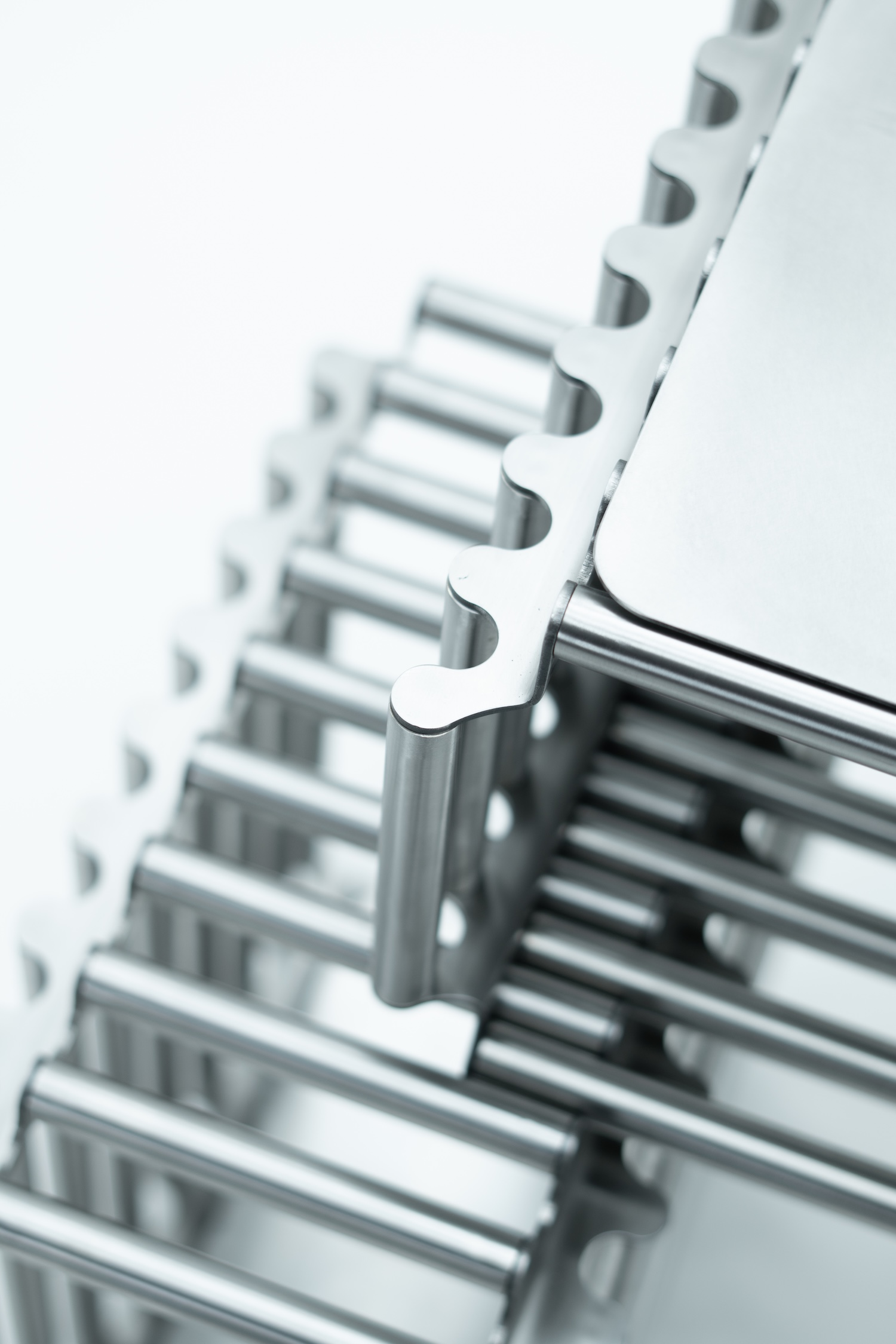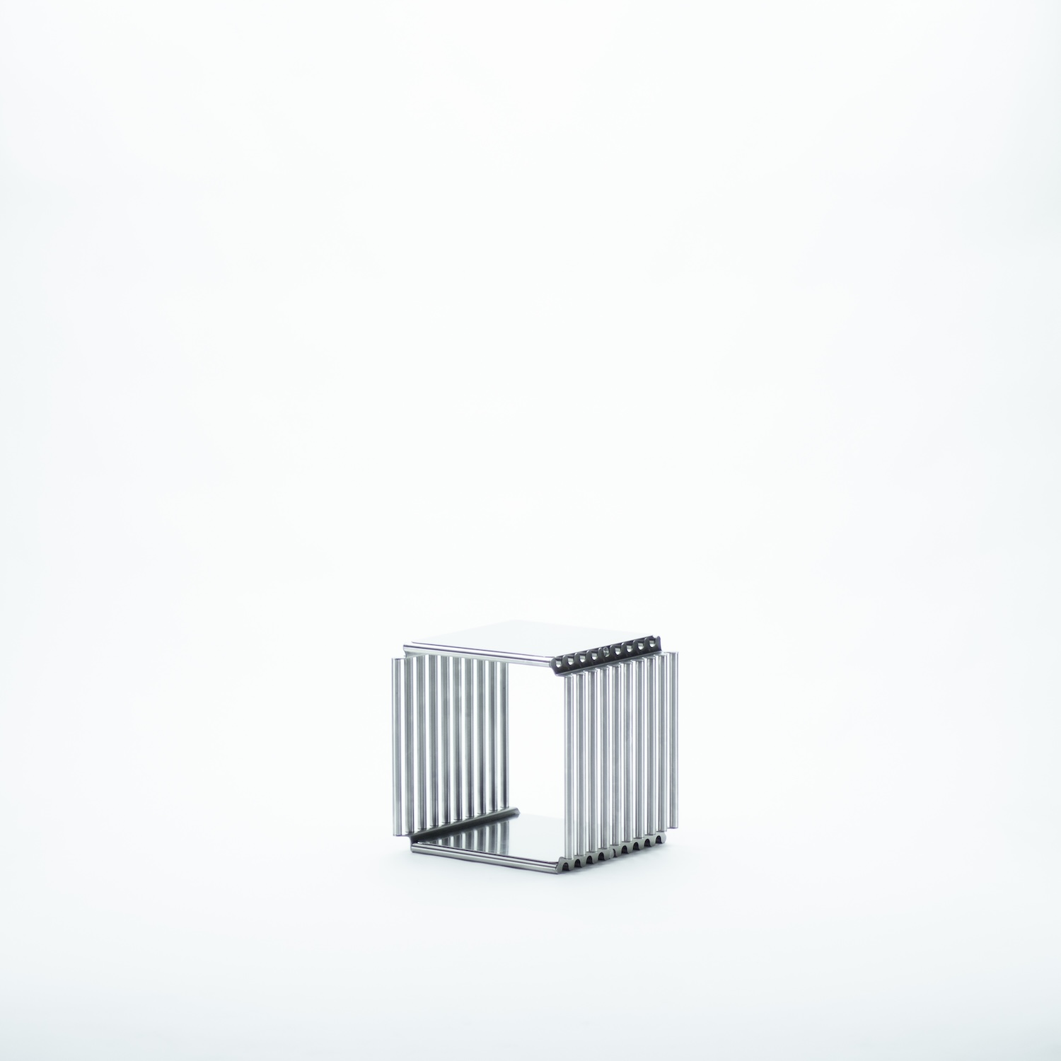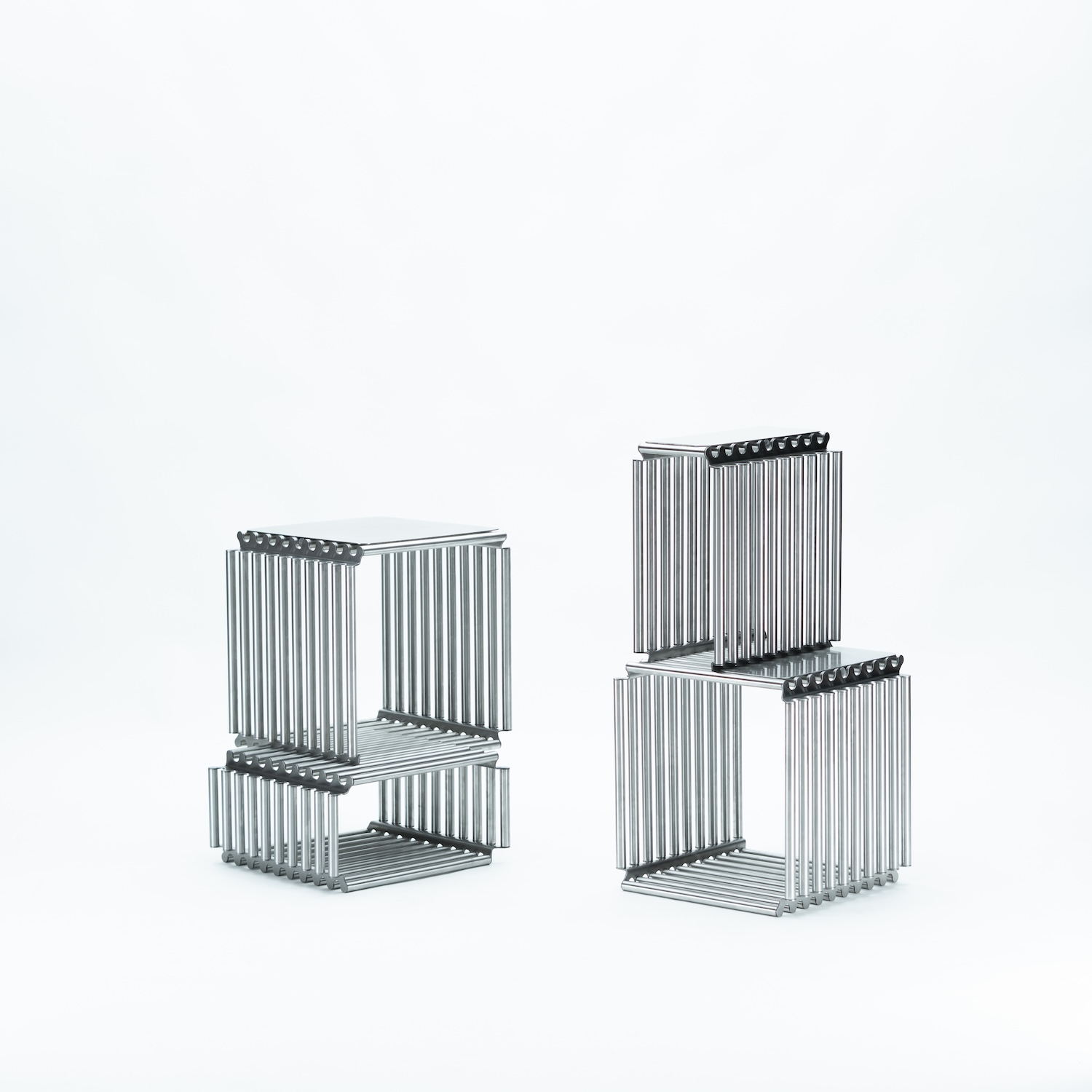 Stainless steel is a demanding material for domestic storage. It resists the warmth of wood and the softness of lacquered metal, demanding that a design earn its place through structural clarity and formal precision. Alarcón works with sheet metal and welded joints rather than cast or extruded profiles, keeping the system visually lean while maintaining the load capacity and vertical stability necessary for a shelf designed to grow in height. The lightness relative to structural performance is not incidental; it is the central engineering problem the design solves.